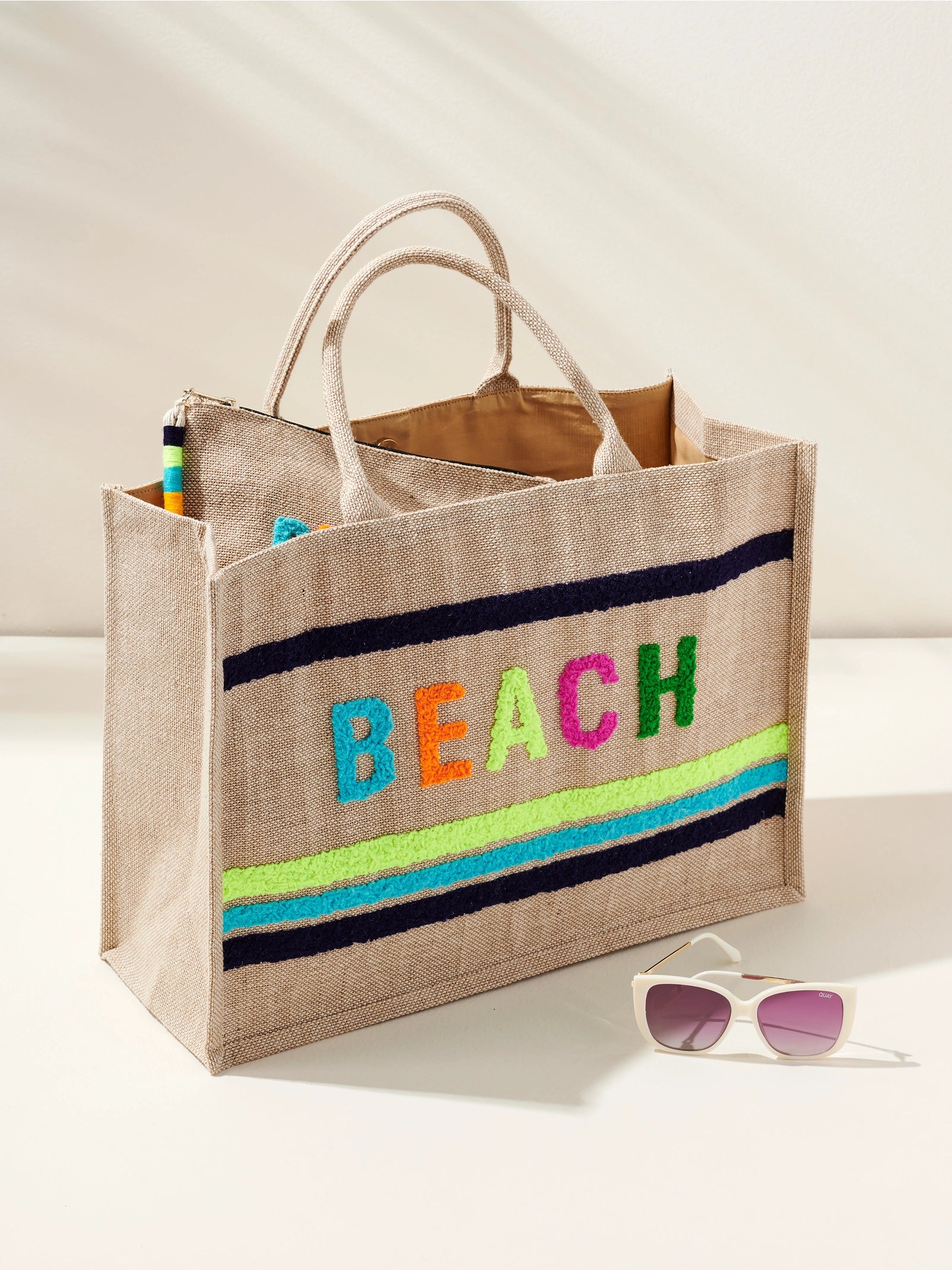 Made from durable, natural jute, this roomy tote features colorful, playful “Beach” embroidery that shouts sunshine and good vibes.