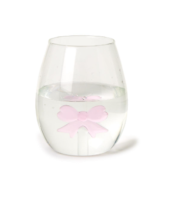 Treat yourself or guests to the Pink Bow Stemless Wine Glass. Handcrafted to perfection, this glass exudes elegance and charm. Perfect for intimate dinners or stylish soirèes, its sleek design adds a touch of sophistication to any setting. Hand wash only to preserve its delicate craftsmanship.